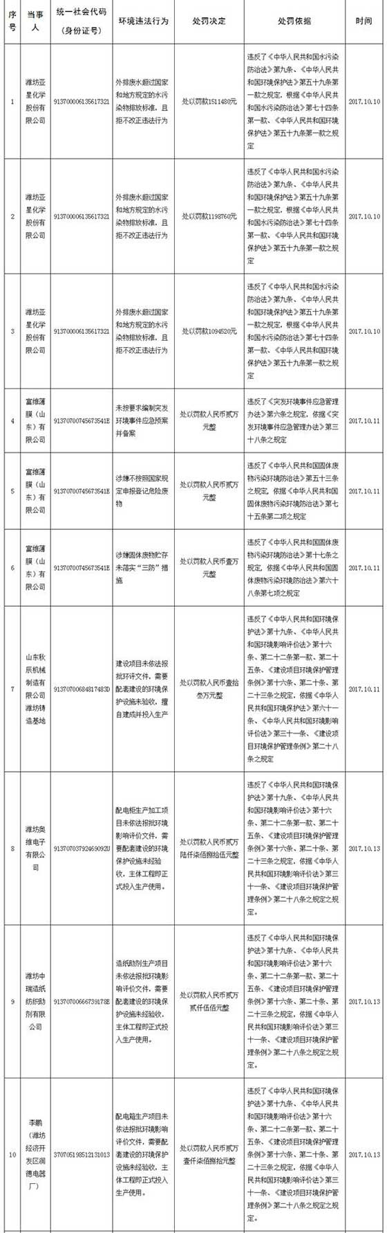 此外,山東中鐵華盛機械有限公司因需要配套建設的環境保護設施未驗收,主體工程投入生產,違反了《建設項目環境保護管理條例》第二十條、二十一條、第二十三條之規定。企業被責令停止生產,并罰人民幣伍萬元整。濰坊天一環保科技有限公司因未依法報批環評文件,需要配套建設的環境保護設施未驗收,擅自建成并投入生產,違反了《中華人民共和國環境保護法》第十九條、《中華人民共和國環境影響評價法》第十六條、第二十二條第一款、第二十五條、《建設富維薄膜(山東)有限公司因未按要求編制突發環境事件應急預案并備案處以罰款人民幣貳萬元整、涉嫌不按照國家規定申報登記危險廢物處以罰款人民幣貳萬元整、涉嫌固體廢物貯存未落實“三防”措施處以罰款人民幣壹萬元整;山東秋辰機械制造有限公司濰坊鑄造基地因建設項目未依法報批環評文件,需要配套建設的環境保護設施未驗收,擅自建成并投入生產,處以罰款人民幣壹拾叁萬元整;濰坊奧維電子有限公司因配電柜生產加工項目未依法報批環境影響評價文件,需要配套建設的環境保護設施未經驗收,主體工程即正式投入生產使用,處以罰款人民幣貳萬陸仟柒佰捌拾伍元整;濰坊中瑞造紙紡織助劑有限公司因造紙助劑生產項目未依法報批環境影響評價文件,需要配套建設的環境保護設施未經驗收,主體工程即正式投入生產使用,處以罰款人民幣貳萬貳仟伍佰元整;李鵬(濰坊經濟開發區潤德電器廠)因配電箱生產項目未依法報批環境影響評價文件,需要配套建設的環境保護設施未經驗收,主體工程即正式投入生產使用,處以罰款人民幣貳萬壹仟柒佰捌拾元整;濰坊紅柳機械開發有限公司因拖拉機組裝項目未依法報批環境影響評價文件,需要配套建設的環境保護設施未經驗收,主體工程即正式投入生產使用,處以罰款人民幣叁萬壹仟貳佰元整;壽光福麥斯輪胎有限公司因排放大氣污染物超過國家和地方規定的排放標準,處以罰款人民幣壹拾萬元整。