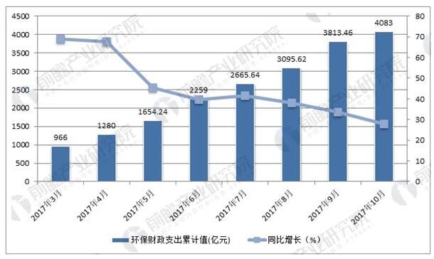從“九五”時期開始,我國政府高度重視環(huán)境保護工作,環(huán)境保護投資呈現(xiàn)快速增長趨勢。整個“九五”期間環(huán)境保護投資3600億元,是“八五”期間環(huán)境保護投資的0.93%。據(jù)前瞻產(chǎn)業(yè)研究院發(fā)布的《2017-2022年中國環(huán)保行業(yè)發(fā)展前景與投資預測分析報告》數(shù)據(jù)顯示,截止2017年10月底,累計環(huán)保財政支出突破4000億,同比增長28.0%。