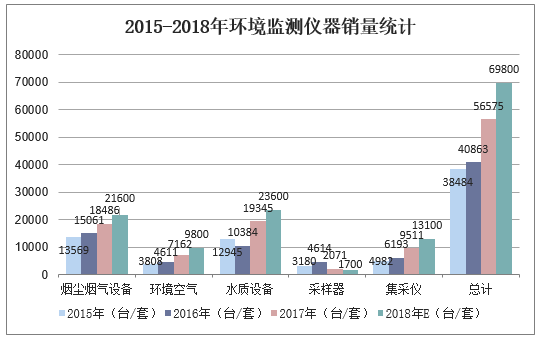據(jù)統(tǒng)計(jì),2018年煙塵煙氣設(shè)備銷量約21600臺(tái)(套),環(huán)境空氣類監(jiān)測(cè)設(shè)備約9800臺(tái)(套),水質(zhì)設(shè)備約23600臺(tái)(套),采樣器約1700臺(tái)(套),整采儀約13100臺(tái)(套),合計(jì)69800臺(tái)(套)。